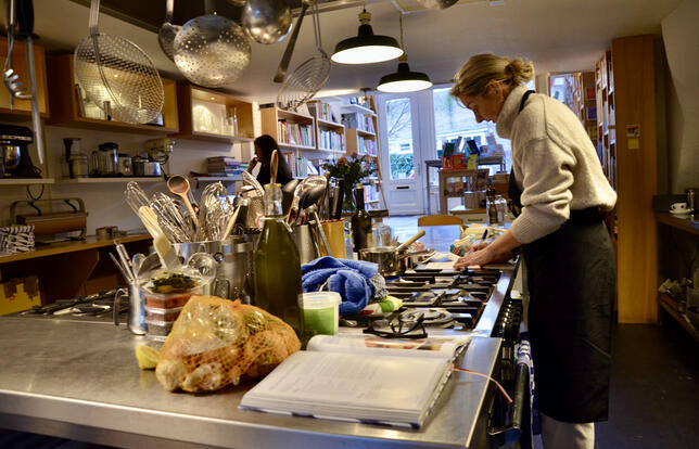 Amsterdam, non loin d’un canal. De l’extérieur, c’est une simple et chaleureuse librairie spécialisée dans les livres de recettes. Mais une fois la porte poussée, le nez frémit. Un plat en sauce est réellement en préparation. Le regard se porte vers la seconde partie de la boutique : une cuisine de professionnels, de bois et d’acier.