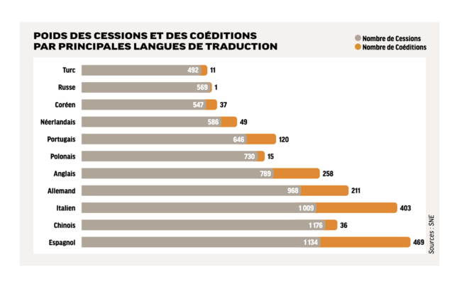 Devant, l’Espagne reste le numéro 1 pour les éditeurs français, ceci pour la troisième année consécutive, avec 1 600 contrats annuels environ. « En ajoutant à l’espagnol et à l’italien les langues chinoise, allemande, anglaise, portugaise et polonaise, on atteint plus de la moitié des contrats conclus », précise le dernier rapport SNE / France Livre.