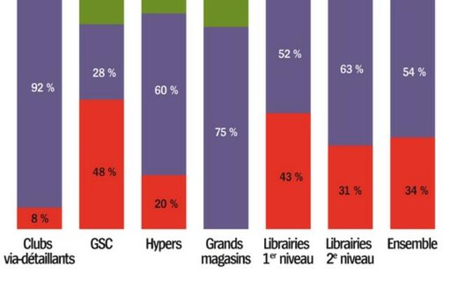 Au global, 54 % des libraires ou des responsables de rayon interrogés cet été prévoyaient de maintenir pour la rentrée leurs commandes au niveau de celles de l'an dernier, selon I + C. La prudence dominait toutefois dans les rayons livres des grandes surfaces culturelles (GSC), dont 48 % des responsables avaient réduit leurs commandes, soit deux fois plus que ceux qui envisageaient de les augmenter. C'est néanmoins parmi les GSC que se trouve une forte proportion (24 %) d'enthousiastes se préparant à relever leurs commandes de la rentrée. Car la circonspection domine chez les libraires de 1er niveau : 43 % d'entre eux annonçaient leur intention de baisser leurs commandes, contre 5 % seulement annonçant une hausse, la majorité (52 %) optant pour le statu quo. En hypermarchés, les acheteurs se montraient encore plus nombreux (60 %) à ne rien changer dans leur volume de commande. Ces trois circuits contrôlent environ 60 % du marché du livre.