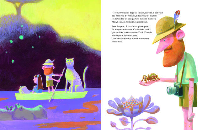 Rutilante épave. Louis et sa mère filent en direction du sud à bord d'une jolie décapotable rouge cerise. Un drôle de petit bruit têtu dans le moteur les intrigue, mais ce n'est rien. La maman soulève le capot et en deux coups de cuiller à pot, hop, identifie et répare la panne. Normal, son métier est de réparer des épaves et de les briquer à volonté pour ensuite les revendre à des collectionneurs. L'adorable petit coupé cerise n'est autre que l'une d'entre elles. Sur le siège passager, Louis consulte le GPS et indique les directions à suivre. Après Saint-Étienne, les couleurs du paysage sont plus chaudes et bientôt c'est la traversée de la Drôme et du Vaucluse. À la fin de la journée, mère et fils s'arrêtent sur un chemin de terre pour dormir dans la voiture. Le grand-père de Louis faisait déjà le même métier, il retapait les camions d'occasion pour les revendre dans le monde entier. Après que la maman a raconté son histoire, il flotte un drôle de silence dans l'habitacle mais la joie ne tarde pas à revenir. D'autant que les deux circulent maintenant sur la mythique Nationale 7... avant d'arriver à destination dans une mignonne maison bleue au bord de la mer. Son propriétaire n'est autre que l'ouvrier qui a construit la voiture en usine il y a... cinquante-trois ans et qui a maintenant enfin les moyens de se l'acheter ! Ce road-movie un brin nostalgique mais toujours joyeux nous fait traverser la douce France. L'illustration colorée nous infuse son optimisme. Pour conclure, cet album ne fait pas mentir les paroles du Fou chantant : « On est heureux Nationale 7. »