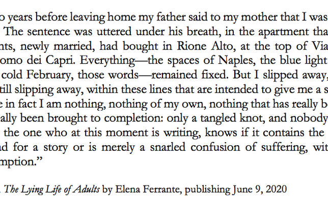 En attendant, Gallimard publiera la traduction d'un autre ouvrage d'Elena Ferrante, L'invenzione occasionale (paru en mai en Italie) sous le titre Chroniques du hasard. Il s'agit de la première publication de la mystérieuse romancière italienne en cinq ans. Initialement publiées dans quotidien britannique The Guardian durant l'année 2018, ces 51 chroniques révèlent la personnalité de l'auteure à travers des thèmes universels tels la société, la politique, l'écriture, le cinéma ou la ville. Toujours attentive à affirmer la puissance du féminin, elle réfléchit aux liens familiaux et amicaux ainsi qu'à la maternité.