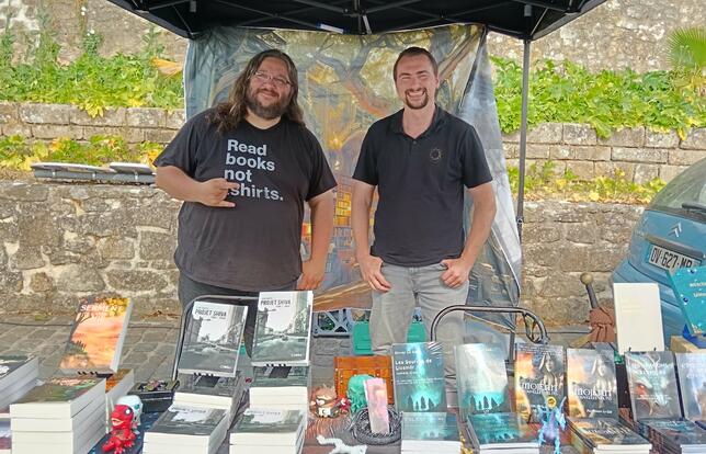 Le fondateur de Mojenn Editions Olivier Le Gal accompagné de son bras droit et écrivain Léon Samoth au festival interceltique de Lorient