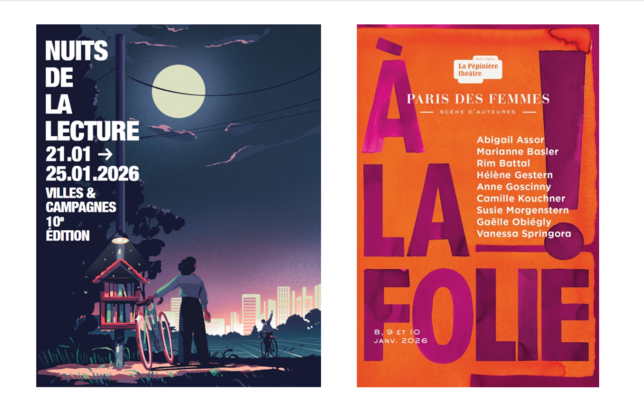 - 10e édition des Nuits de la lecture, du 21 au 25 janvier 2026 partout en France. Organisé par le Centre national du livre sur proposition du ministère de la Culture, cet événement célèbre le plaisir de lire à travers des milliers de manifestations physiques et numériques. Pour cette édition anniversaire, le public est invité à explorer le thème « Villes et campagnes » : des territoires qui s'opposent et se répondent dans la littérature, du roman du XIXe siècle à la science-fiction contemporaine, en passant par les questionnements actuels sur la transition écologique. L'affiche 2026 est signée par l'illustrateur Tom Haugomat. Marie-Hélène Lafon (Prix Renaudot 2020) et Laurent Gaudé (prix Goncourt 2004) seront respectivement marraine et parrain de cette édition. Temps fort : une soirée littéraire et festive le 23 janvier à Ground Control (Paris) avec table ronde, performance croisée lecture-musique (Simon Johannin et Molécule) et DJ set. Plus d’informations ici.