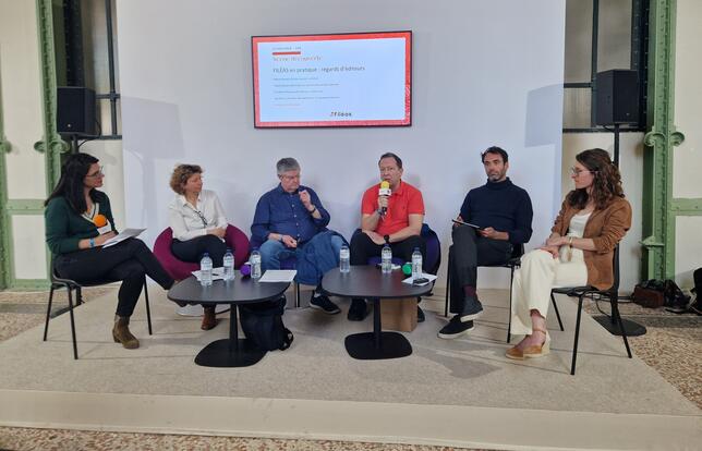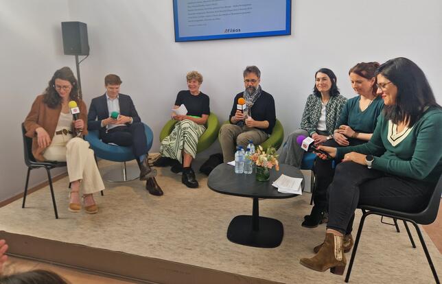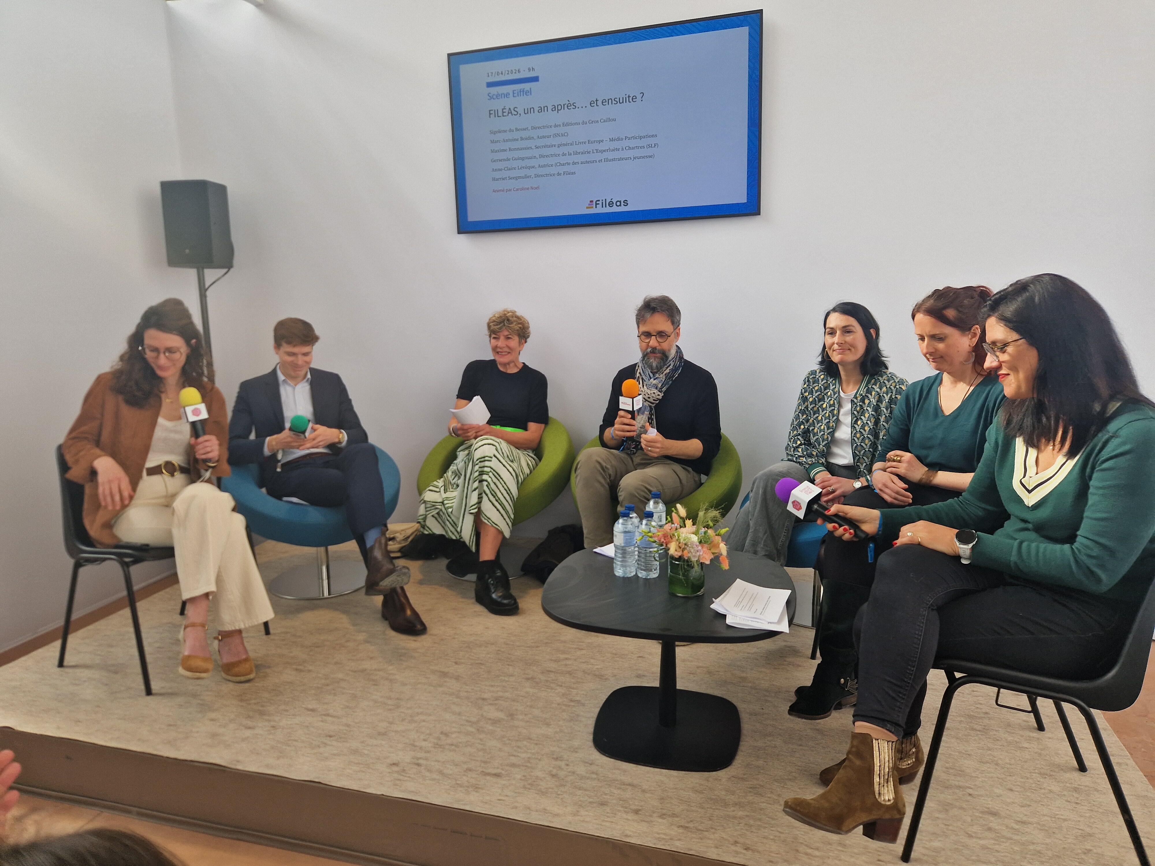 La première table ronde organisée par Filéas avec Harriet Seegmuller (Filéas), Maxime Bonnassies (Média Participations), les auteurs Anne-Claire Lévêque et Marc-Antoine Boidin, Sigolène du Besset (Le Gros Caillou) et Gersende Guingouain (SLF) - Photo CK