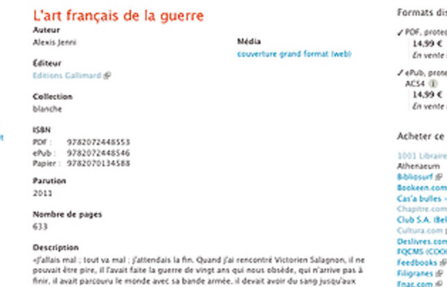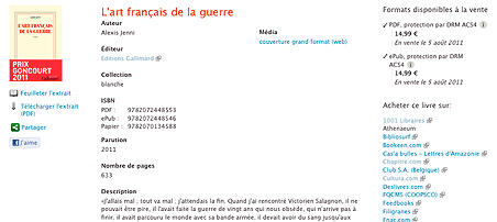 Depuis lundi 19 décembre, sur toutes les librairies numériques, le Goncourt (L'art français de la guerre, Alexis Jenni) est à 14,99 € contre 16,80 € auparavant, le Goncourt des lycéens (Du domaine des murmures, Carole Martinez) est à 11,99 € contre 13,50 € la semaine dernière. Pour tous ses livres numériques, Gallimard a baissé ses prix en anticipant le taux réduit de TVA à 7% (contre 19,6%), tel qu'il doit s'appliquer au 1er janvier prochain. Cette décision concerne les titres de Gallimard, verticales, Gallimard Jeunesse et Les Grandes Personnes. Ceux des filiales suivront, éventuellement avant le 1er janvier aussi.