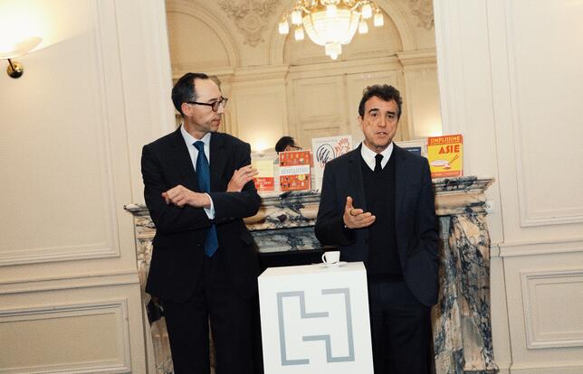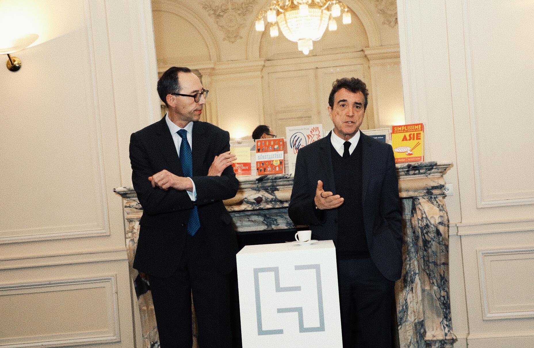 Arnaud Lagardère, P-DG de Louis Hachette Group, et Jean-Christophe Thiery, directeur général délégué, en conférence de presse au palais Brongniart le 13 mars 2026 - Photo Olivier Dion