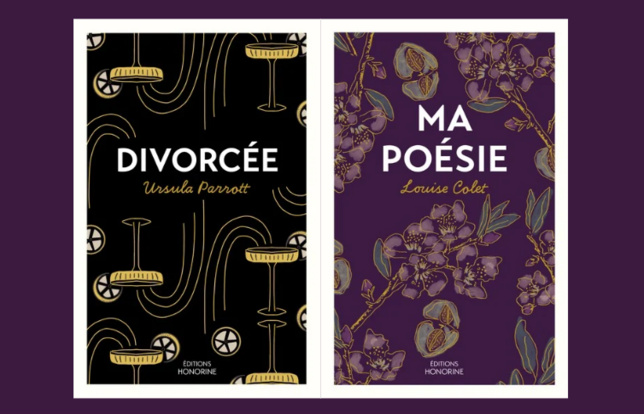 Quatre à six titres maximum paraîtront annuellement pour permettre à l'éditrice de mieux les défendre et les accompagner. Pour sa première année, Honorine publiera quatre titres, à commencer par deux le 30 avril : Divorcée de l'américaine Ursula Parrott, traduit par Sarah Tardy (précédente traduction sous le titre d’Ex-épouse chez Gallimard en 1931), et Ma Poésie, un recueil de poésie de Louise Colet, poétesse acclamée du XIXe.