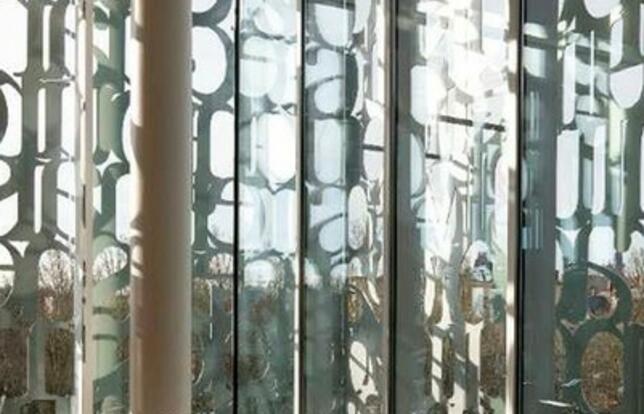 la médiathèque est baignée par la lumière naturelle grâce à ses grandes parois vitrées, décorées et protégées par une calligraphie métallique.- Photo PHOTOS BM DE FOUGÈRESPour télécharger ce document, vous devez d'abord acheter l'article correspondant.