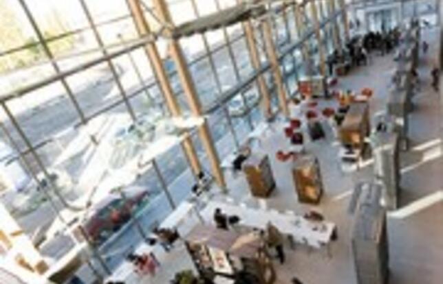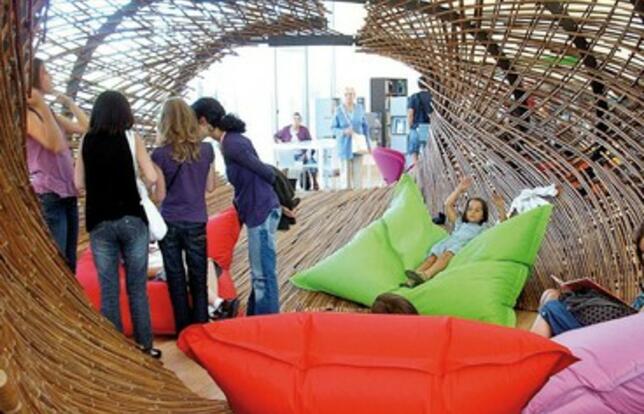 Elle s'appelle La Clairière parce que les élus bretons ont rappelé que les druides avaient coutume de se rassembler dans les clairières pour échanger leur savoir. Elle porte de toute façon bien son nom, cette belle médiathèque de Fougères (Ille-et-Vilaine) dont les parois vitrées, en retrait des façades, sont protégées par une calligraphie métallique rappelant les moucharabiehs arabes. Patios et "failles" vitrées en toiture offrent un maximum de lumière naturelle. La Clairière, 2 500 m2, se compose de deux plateaux ouverts sur deux niveaux. Le premier, précédé d'un grand hall d'entrée volontairement neutre - sans livre -, s'ouvre sur l'espace de presse et sur celui de la "Passerelle", ainsi nommé parce qu'il propose des collections intergénérationnelles - BD, films, musique, documents d'art, livres sur le sport et les loisirs - "pour favoriser les échanges entre enfants, ados, adultes...", explique la responsable, Delphine Pointeau. A l'étage, à côté des collections pour adultes, l'espace jeunesse est plébiscité par tous grâce à l'"Affabulle", sorte de cocon géant en osier prévu initialement pour accueillir enfants et parents, mais vite squatté par les ados qui adorent s'y lover. L'ensemble, simple, avec une signalétique très visible, donne un sentiment de fluidité, de beauté et de confort.