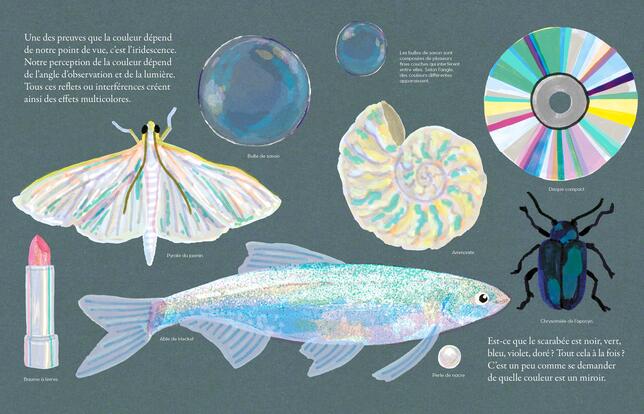 Chartreuse ou fuschia. Autour de nous, la couleur est partout, dans les pétales de fleurs comme dans les ciels d'orage. Mais il n'est pas toujours facile de définir cette chose simple. Dans cet album très personnel, l'illustratrice Léa Maupetit partage le fruit de sa réflexion et de son émerveillement pour ce mystère, s'appuyant autant sur son sens artistique que sur les recherches de scientifiques tels que Chevreul et Newton. Où finit le jaune du kiwi et où commence le bleu de l'œuf de merle ? Où finit le bleu de la myrtille et où commence le rouge du litchi de Chine ? Si certaines couleurs sont franches, d'autres le sont beaucoup moins. Le nuancier est fascinant parce que sans fin. Pour définir un nom de couleur, il y a les appellations gravées dans le marbre, s'inspirant de lieux, d'animaux ou de plantes comme le jaune de Naples, le gris souris ou le bleu lavande, mais on peut aussi, pourquoi pas, inventer les nôtres au gré de notre sens de la métaphore, comme le bleu ciel après la pluie, le marron banane mûre... Au fil des pages multicolores, on jouera aux scientifiques en explorant les trois paramètres que sont la teinte, la saturation et la luminosité, on comprendra le daltonisme, mais surtout on s'extasiera de la délicatesse des couleurs comme de leurs pouvoirs. Elles peuvent être signe de pourrissement d'un agrume trop mûr qui vire de l'orange au vert-de-gris ou alors arme de séduction chez un papillon mâle, dont les ailes fabuleuses attirent les femelles. Bref, notre curiosité et nos mirettes seront à la fête !