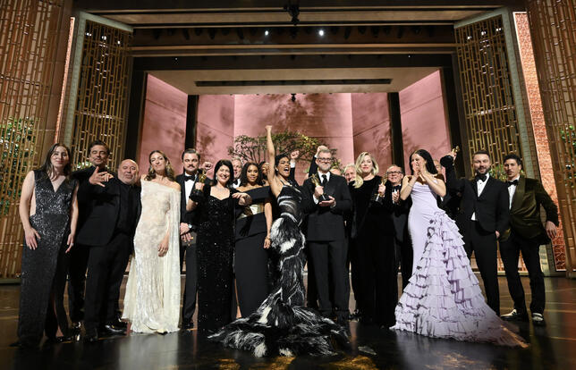 L'équipe du film "Une bataille après l'autre", adaptée de "Vineland" de Thomas Pynchon, lors de la cérémonie des Oscars 2026 - Photo Richard Harbaugh / The Academy / AFP
