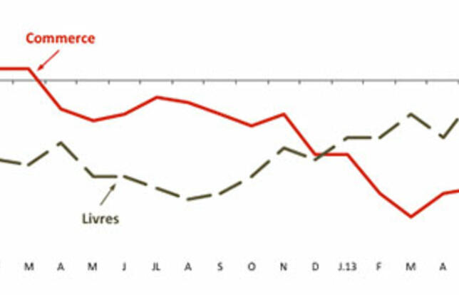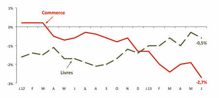 Après un mois de mai en progression (+ 2,5 %), les ventes mensuelles de livres reculent en juin, à - 3 % en euros courants par rapport à juin 2012, d'après notre baromètre Livres Hebdo/I+C. L'évolution est aussi de - 3 % en volume, du fait de l'absence quasi-totale d'inflation, d'après les indices INSEE des prix du livre.