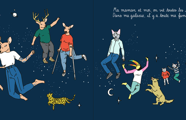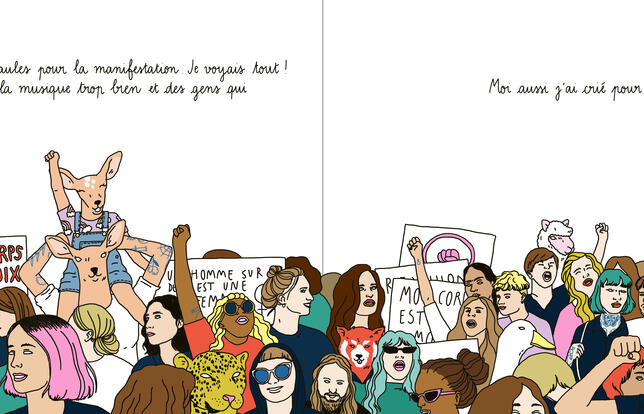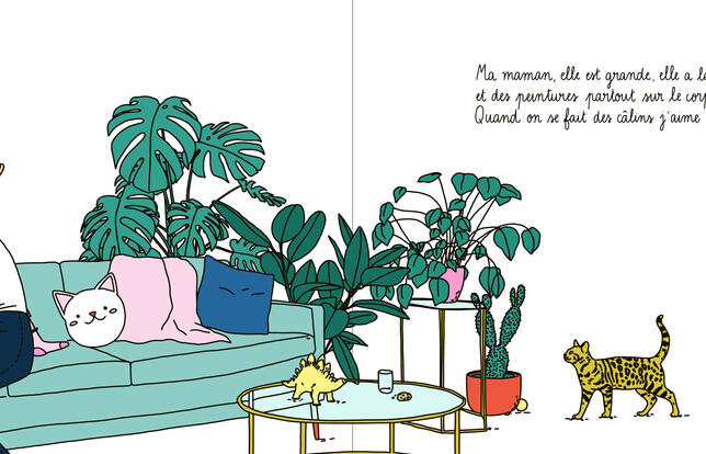 Grande, cheveux courts, tatouée de la tête aux pieds, la maman héroïne de cet album est aux antipodes des modèles qui ont souvent cours dans la littérature jeunesse : mères parfaites, discrètes, voire effacées, fées du logis accomplies, pomponnées ad hoc. Elle, son genre serait plutôt les potes, le rock et les teufs ! Verdict de Rose, la copine de sa petite fille : « Elle est bizarre, ta maman ! » Quand dans la rue on lui demande si elle est une femme ou un homme, elle hausse les épaules et aussitôt un sourire énigmatique naît sur ses lèvres... Avec une telle génitrice, la fillette ne s'ennuie jamais. Elle danse dans la cuisine et court les spectacles où les acteurs jettent leurs habits en criant et se roulent tout nus par terre. Elle fréquente des expos avec plein de gens qui font un peu peur mais où heureusement on distribue des fraises en bonbons... Ses copains très rigolos arborent des bijoux dans le nez et du vernis sur les ongles. Autre trait de caractère de la maman : la bougeotte. Même au parc elle ne tient pas en place. Pas une manif féministe où elle ne défile avec sa fillette sur les épaules. Sur les panneaux on peut lire : « Liberté égalité sororité ». Que l'on se rassure, à l'heure du coucher, elle vient tout de même faire des bisous à sa petite chérie. Cette égérie féministe flanquera sûrement de l'urticaire à toutes les dames patronnesses de France et de Navarre. Son éducation est plus tournée vers l'ouverture au monde et la joie de vivre que vers les principes moralisateurs. Bizarre ou pas, nous, cette maman, on l'aime ! Anna Wanda Gogusey, l'illustratrice, visiblement aussi, qui l'a dessinée avec une adorable tête de biche.