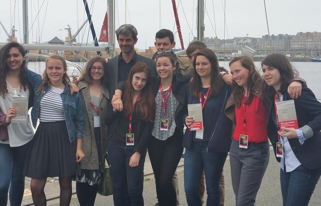 Sylvain Coher, lauréat du Prix Ouest-France Etonnants voyageurs, entourés des membres du jury âgés de 15 à 20 ans.- Photo MARIE DESMEURES