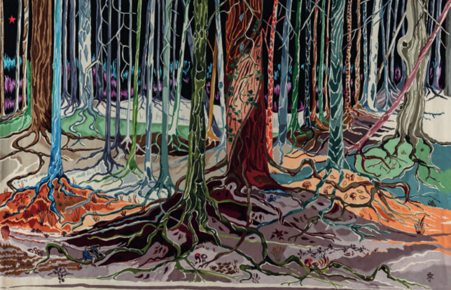 Quatorze tapisseries murales en lien avec les différents ouvrages de Tolkien structurent l’exposition, comme Les Lettres du Père Noël, Le Hobbit, Le Seigneur des Anneaux et Le Silmarillion. Ces quatre œuvres sont toutes publiées aux éditions Christian Bourgois, comme la globalité de la bibliographie de l'écrivain britannique.