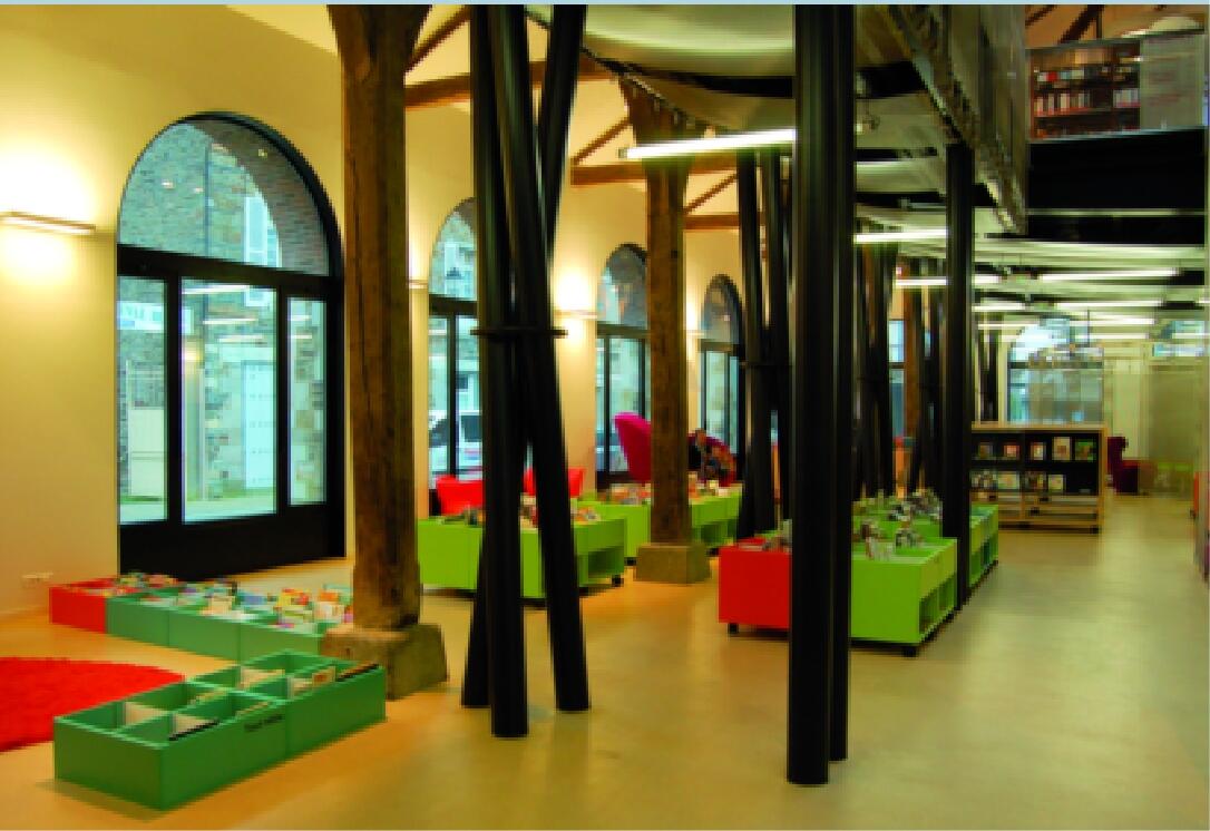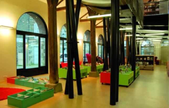 A Châteaugiron, petite commune de 6 000 habitants au sud-est de Rennes, difficile de manquer la bibliothèque municipale, installée au cœur de la ville dans les anciennes halles. Ouvert en septembre 2011, le bâtiment de 1 200 m2, entièrement vitré, revisité par l’architecte Dominique Bonnot, attire le regard et invite à pousser la porte. « On avait envie de changer l’image de la bibliothèque, et qu’au premier abord on voit autre chose que des rayonnages de livres », explique la directrice, Isabelle Berta. Ce que découvre en premier le visiteur, c’est une belle galerie d’exposition. Puis il entre dans l’espace proposant la « culture chaude » : presse, fiction, BD, romans graphiques, présentés sur de discrets rayonnages bas, et canapés confortables. Pas de signalétique pour délimiter les espaces pour adultes et ceux pour la jeunesse. « Il faut absolument s’affranchir de cette distinction, défend Isabelle Berta. C’est juste induit par le mobilier et les couleurs. » Le coin pour les plus petits propose des jeux et des déguisements prêtés par la ludothèque voisine, ce qui a tendance à faire régulièrement monter le niveau de décibels ! Une conséquence assumée par l’équipe, qui considère que la bibliothèque est un lieu vivant. Au premier étage, consacré aux documentaires répartis par pôles thématiques aux intitulés plus attractifs que la Dewey (« Langues et littérature », « Loisirs et voyages »), l’ambiance est plus studieuse, tandis qu’en mezzanine l’espace musique et le cyber- espace assurent la transition.