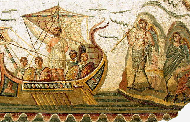 Ulysse et les sirènes, mosaïque romaine du IIe siècle après J.-C., musée du Bardo à Tunis.- Photo DOMAINE PUBLICPour télécharger ce document, vous devez d'abord acheter l'article correspondant.